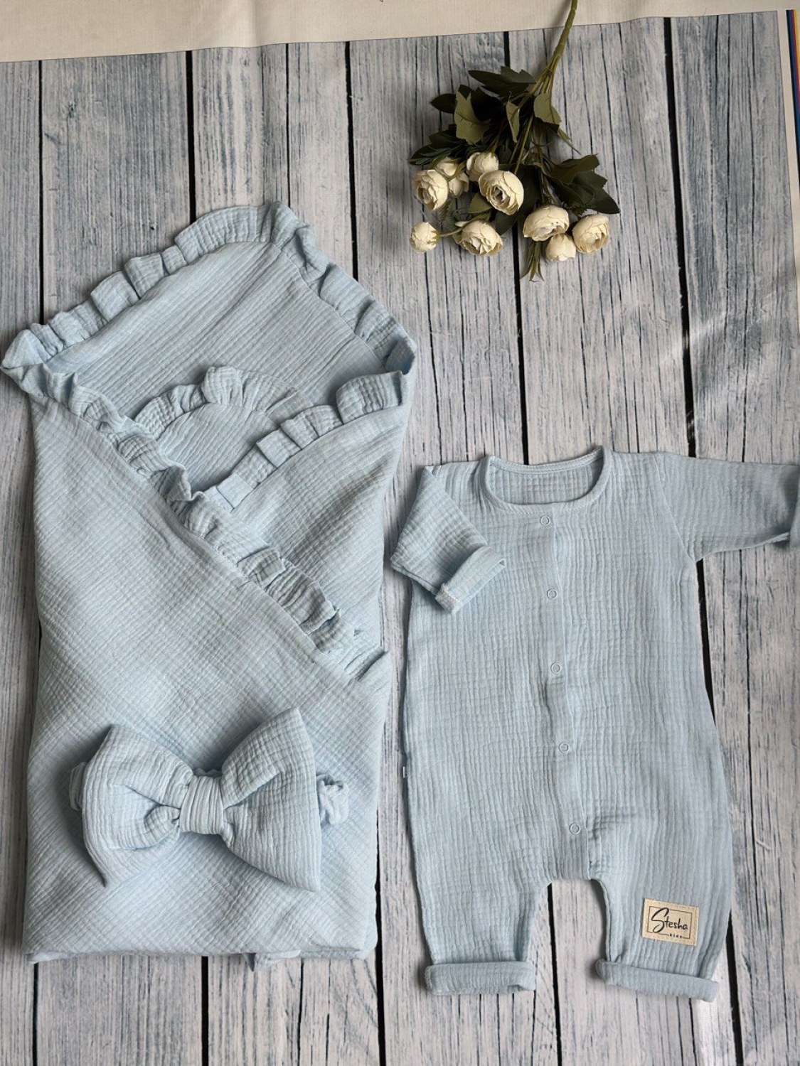 335-Г. Комплект из детского комбинезона, р 56 и конверта муслин, хлопок 100% 90/90 см, голубой