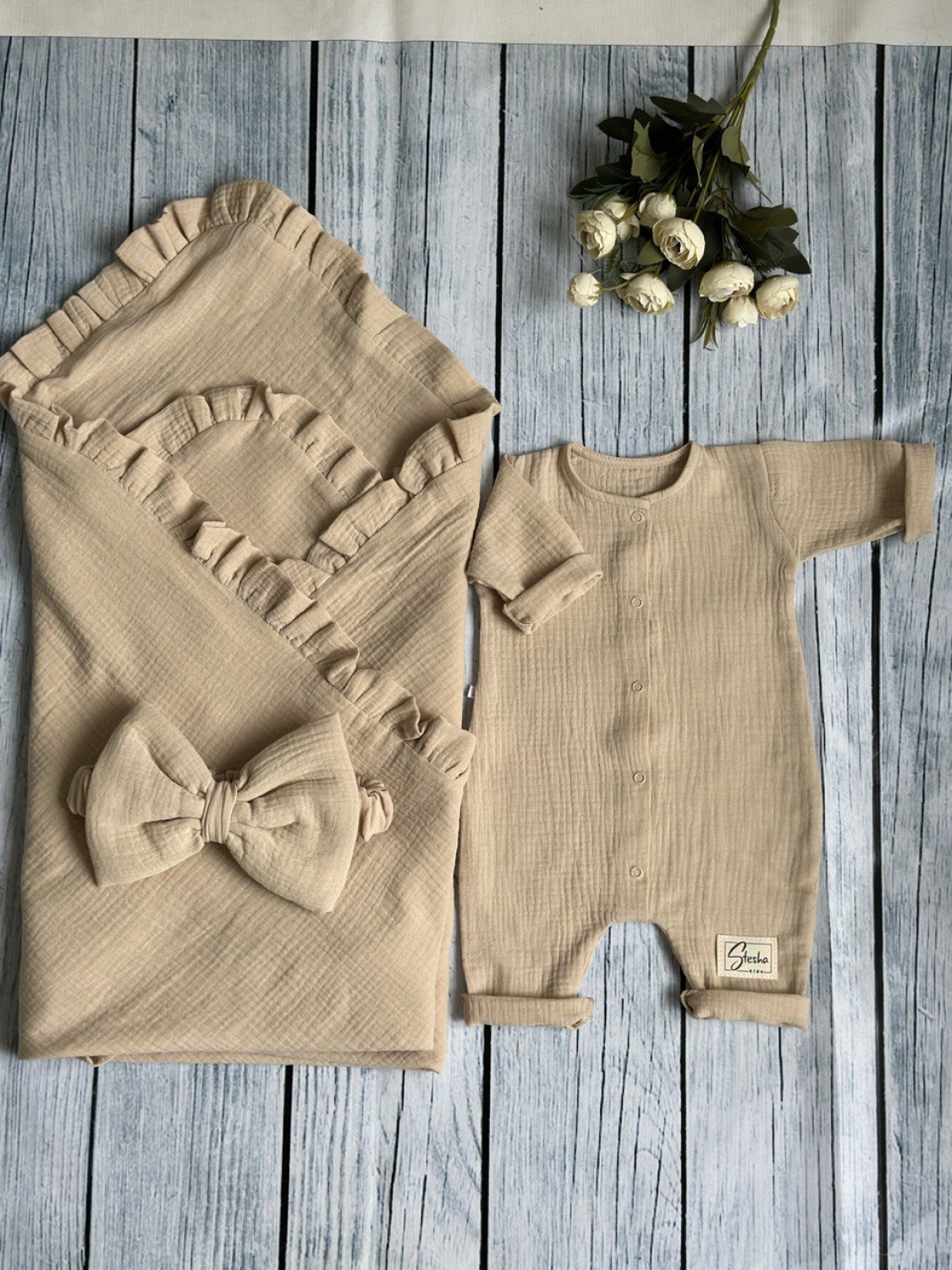 Теги: Купить детские конверты, комбинезон оптом, детские конверты на выписку оптом. 335-К. Комплект из детского комбинезона, р 56 и конверта муслин, хлопок 100% 90/90 см, кофейный цена,отзывы официальный сайт "Стеша Вологда"