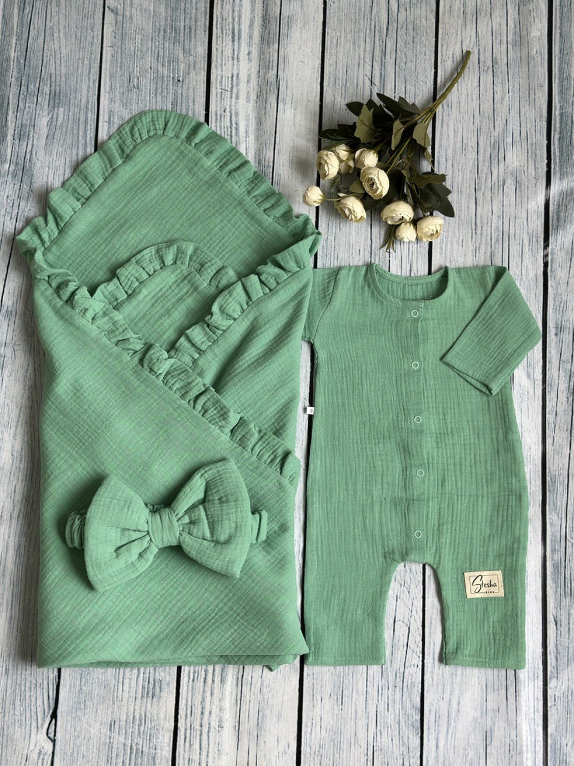 Теги: Купить детские конверты, комбинезон оптом, детские конверты на выписку оптом. 335-ОЛ. Комплект из детского комбинезона, р 56 и конверта муслин, хлопок 100% 90/90 см, олива цена,отзывы официальный сайт "Стеша Вологда"